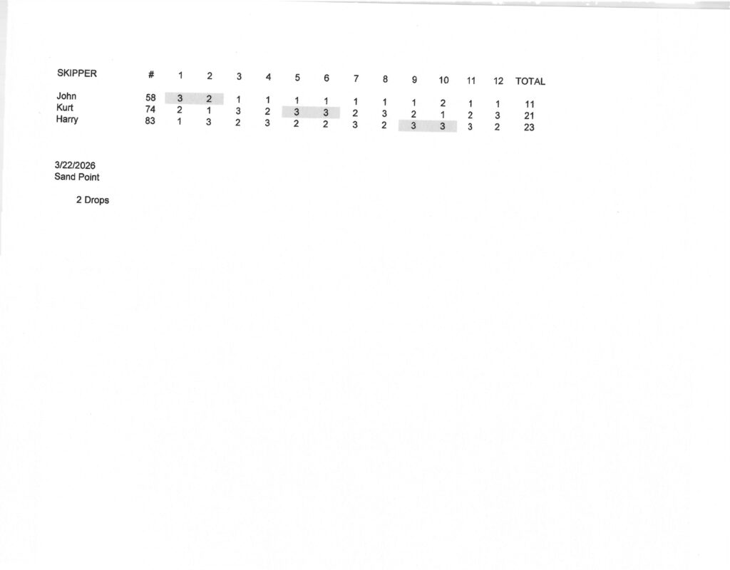 OCTOBER CANCELLED DUE TO POURING RAIN. 2 POINTS AWARDED TO KENT & JOHN FOR SHOWING UP AND TRYING TO SAIL.
